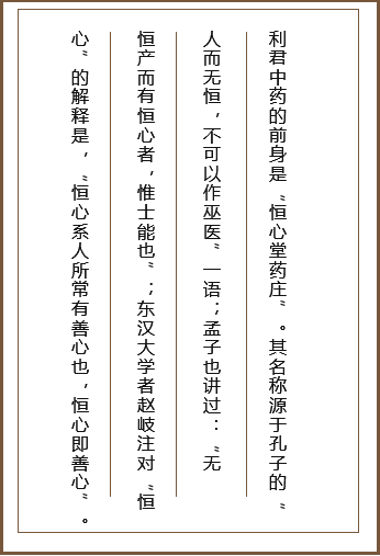 利君中藥具有近400年的悠久歷史。公司前身“恒心堂藥莊”始創于明朝末期,興盛于清代、民國,其招牌產品“坎壢妙濟 丹”、“參茸固本還少丹”功能獨特、療效神奇,享譽廣大西部地區,有“神農妙濟”之美譽,歷代名人左宗棠、于佑任、 屈武等都留有書聯贊譽。民國時期,“恒心堂”在西北5省及山西、四川、云南均設有分號,坐大西部藥界,同北京“同仁 堂”、浙江“胡慶余堂”、廣州“陳李記”一起,被稱為“四大藥莊”,是國內為數不多的幾家具有數百年歷史的中藥“老 字號”之一。