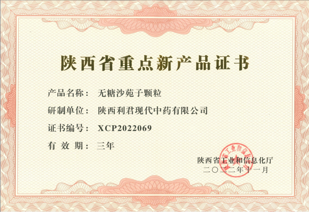 原沙苑子顆粒為國藥準(zhǔn)字OTC乙類產(chǎn)品,是陜西利君現(xiàn)代中藥有限公司的前身---渭南地區(qū)制藥廠首創(chuàng)研發(fā)的產(chǎn)品,原料采用渭南沙苑一帶地道藥材沙苑子,經(jīng)科學(xué)提煉精制而成的有糖型顆粒。全國擁有該產(chǎn)品批文的企業(yè)共2家,且全部為含糖顆粒,本項目研發(fā)沙苑子顆粒(無糖型)為全國首創(chuàng),2022年5月獲得國家藥品監(jiān)督管理局批文后即成為全國獨家品種,其執(zhí)行的產(chǎn)品標(biāo)準(zhǔn)也成為了獨家標(biāo)準(zhǔn)。